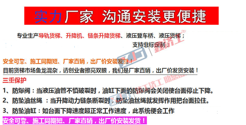 濟(jì)工牌升降電梯產(chǎn)品特點:固定式導(dǎo)軌升降機(jī)平臺是用于高空作業(yè)的專用設(shè)備,用途廣泛。該設(shè)備具有導(dǎo)軌結(jié)構(gòu),鏈條傳動,液壓舉升,工作面大,承重能力強(qiáng),整機(jī)穩(wěn)定性高,適合兩用作業(yè)。該設(shè)備適用于無法挖坑的工作場所。它具有單崩潰和雙崩潰。該機(jī)運轉(zhuǎn)平穩(wěn),安全可靠,適用于超市,醫(yī)院,飯店,車間等行業(yè)的貨物輸送。此外,正確選擇設(shè)備的各種配置可以大限度地利用升降平臺的功能,并達(dá)到使用效果。該產(chǎn)品的主要旋轉(zhuǎn)部件采用耐磨的復(fù)合軸套和滾針軸承,可減少支撐桿和支撐桿銷之間的磨損,從而延長設(shè)備的使用壽命。使用液壓升降機(jī)時,應(yīng)保持工作表面水平。此外,該產(chǎn)品還廣泛用于工業(yè)和采礦企業(yè),以代替電梯來提升貨物。具有結(jié)構(gòu)簡單,承載能力大,使用壽命長,維修方便,安全實用等特點,特適用于不能用豎井在地下挖基礎(chǔ)的場所。該設(shè)備的廣泛應(yīng)用,不僅使高空作業(yè)的范圍更廣,而且大大提高了作業(yè)效率。它是工廠和企業(yè)倉庫物流以及貨物起重中的起重設(shè)備。